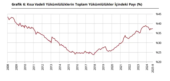 6️⃣ Ağustos ayı verilerine göre, finansal kesim dışındaki firmaların net döviz pozisyonu açığı itibarıyla 184,9 milyar dolara yükseldi. Artışın büyük bölümü hem yurt içi hem de yurt dışı kredilerden kaynaklandı. Varlık tarafında ihracat alacakları ve yurt dışına doğrudan yatırımlar başı çekerken, 2021 sonrası görülen güçlü artış eğilimi 2025’te yavaşlamış durumda. Türev varlıklardaki dalgalanma, firmaların döviz riskini hedge etme eğilimini artırdığını gösteriyor. Buna karşılık yükümlülüklerde artış hızı daha yüksek seyrediyor. Özellikle kur şokları sonrası daralan dış borçlanma, 2021’den itibaren yeniden ivme kazanmış durumda. Kısa vadeli yükümlülüklerin toplam yükümlülükler içindeki payı %37 düzeyinde seyrederken, vade yapısında uzun vadeli borçlara yönelim dikkat çekiyor. 2008’de %45 seviyesinde olan bu oran 2016’da %25’e kadar gerilemiş, son yıllarda ise %38–40 bandına oturmuş durumda.