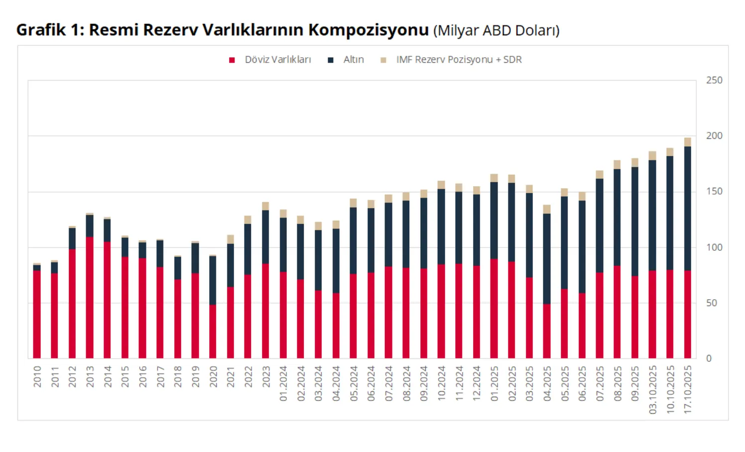 3️⃣ TCMB verilerine göre, 17 Ekim ile biten haftada toplam rezervler altın etkisiyle 8,7 milyar dolar artarak 198,4 milyar dolara yükselirken, net uluslararası rezervler 79,5 milyar dolar seviyesine çıktı. Aynı dönemde yurtiçi yerleşiklerin yabancı para mevduatları 9,7 milyar dolar artışla 218,3 milyar dolara ulaştı. Gerçek kişilerin döviz tevdiat hesapları 7,6 milyar dolar artarken, bunun 7,3 milyar doları altın kaynaklı oldu. Kur etkisinden arındırıldığında toplam mevduat artışı 2,3 milyar dolara denk geliyor. TCMB verilerine göre, 17 Ekim ile biten haftada yabancı yatırımcılar hisse senetlerinde 178 milyon dolar net satış yaparken, devlet iç borçlanma senetlerinde (DİBS) 151 milyon dolar ve özel sektör tahvillerinde 2 milyon dolar net alım gerçekleştirdi. Yılbaşından bu yana bakıldığında, hisse senetlerinde 1,36 milyar dolar, DİBS’te 976 milyon dolar ve özel sektör tahvillerinde 342 milyon dolar olmak üzere toplam 2,68 milyar dolarlık yabancı girişi gerçekleşti.