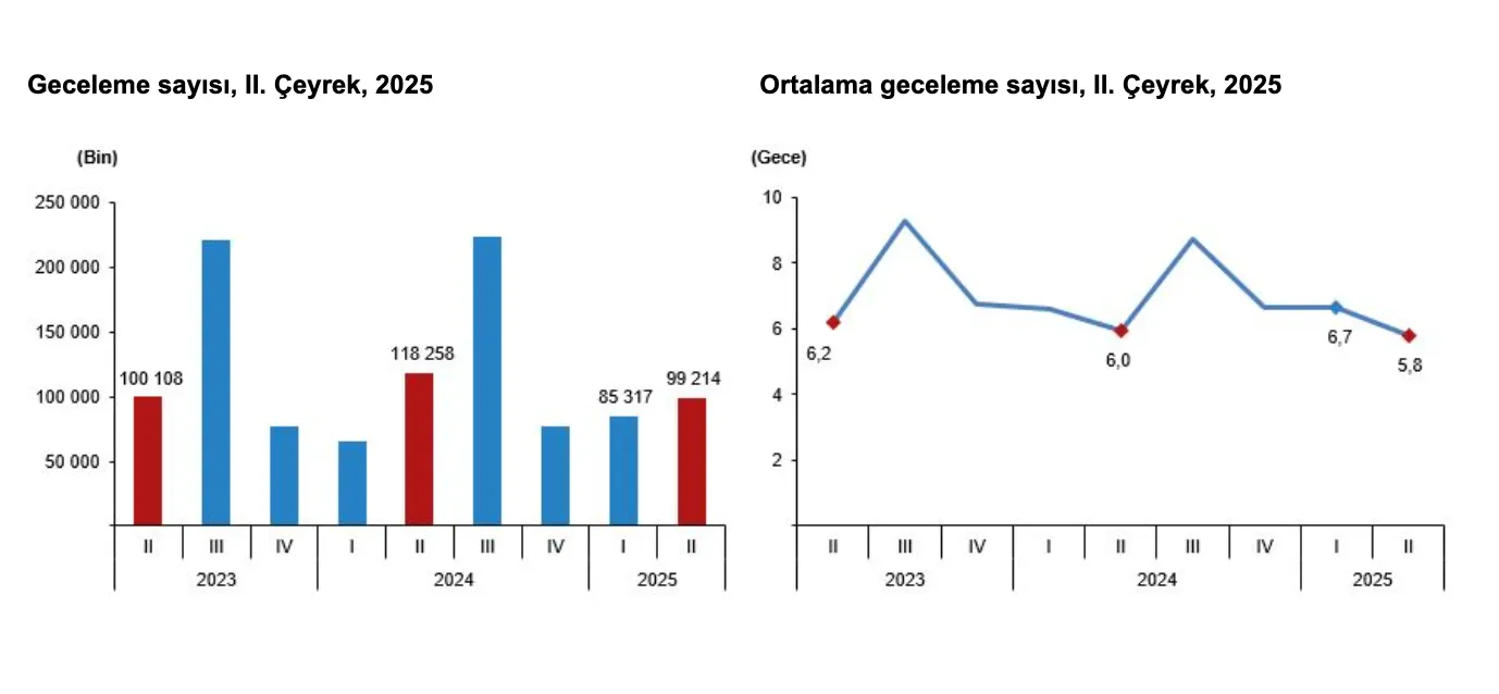 3️⃣ Türkiye İstatistik Kurumu verilerine göre, 2025 yılının ikinci çeyreğinde yurt içinde ikamet eden 13 milyon 938 bin kişi seyahate çıktı. Toplam seyahat sayısı yıllık bazda %13,9 azalarak 17 milyon 76 bine gerilerken, toplam geceleme sayısı 99 milyon 214 bin, ortalama konaklama süresi ise 5,8 gece olarak gerçekleşti. Ortalama geceleme son 11 yılın en düşük seviyesine geriledi. Yerli turistlerin bu dönemdeki toplam harcaması 116,9 milyar TL’ye ulaşarak geçen yıla göre %13,4 arttı. Seyahat başına ortalama harcama 6.848 TL olurken, harcamalarda en yüksek payı %30,1 ile yeme-içme, %25,8 ile ulaştırma ve %15,7 ile konaklama aldı.