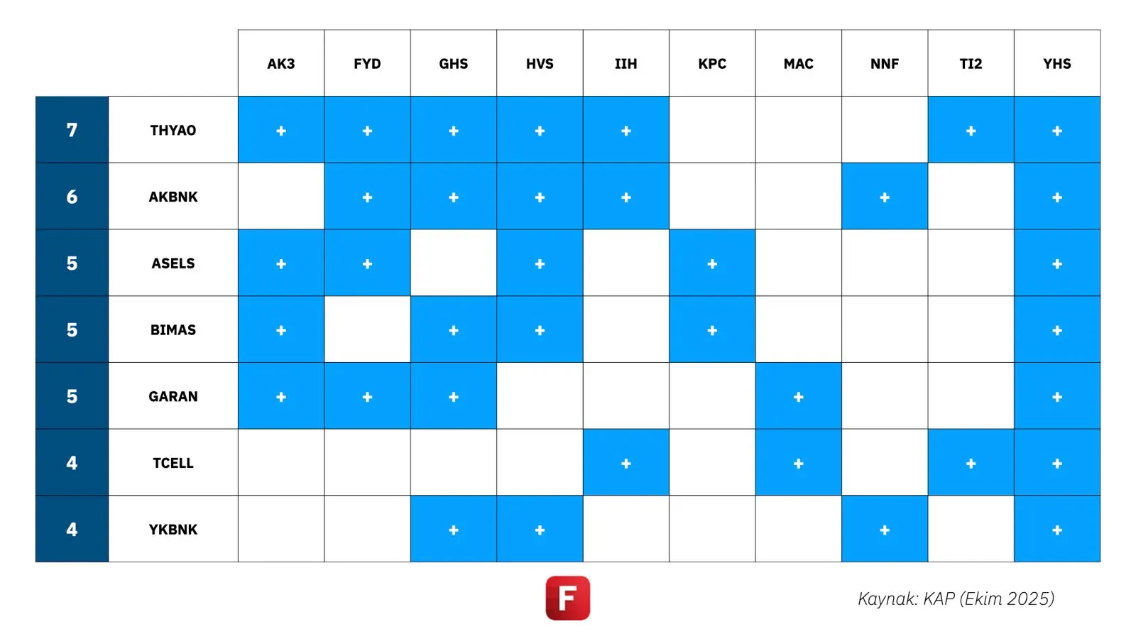 Bültenimizde yer verdiğimiz yatırım fonlarının ortak tuttuğu hisseleri 2 kritere göre seçtik. Bunlardan ilki, ağırlığın %4’ten fazla ortak olarak bulunması. Diğeri ise en az 4 fonda bulunması.