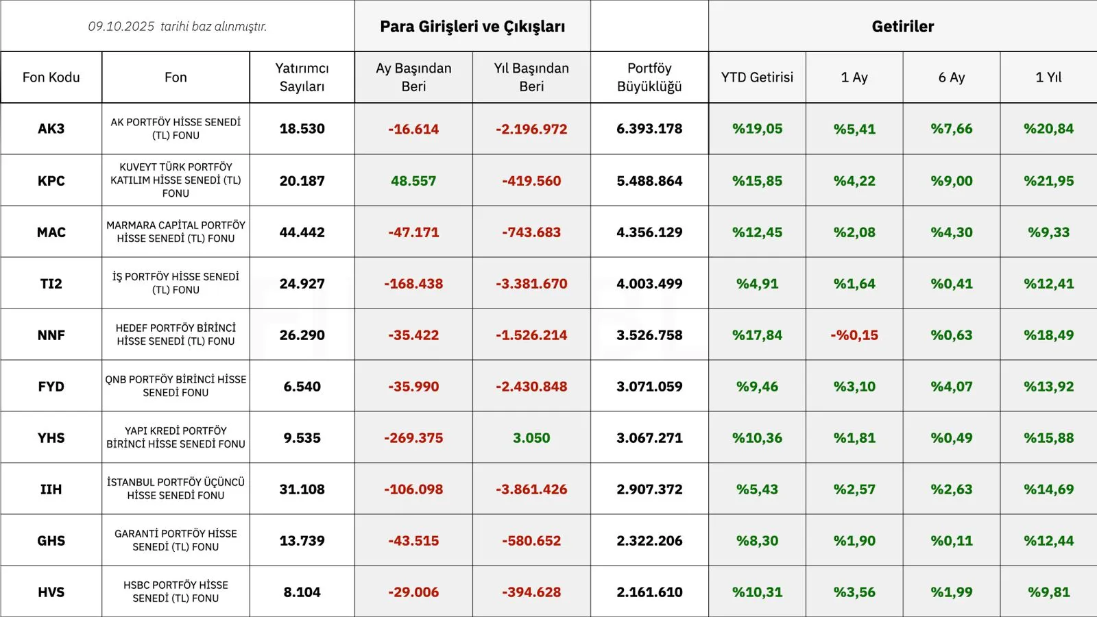 Bültenimizde yerli hisse senedi yoğun fon tarafında aşağıdaki 10 fona ait detaylı bilgileri paylaşacağız. Bu fonları belirli kriterlere göre seçtik. Kriterlerden ilki, TEFAS’ta işlem görüp her ay portföy dağılımını KAP’a bildirmesi. İkinci kriterimiz yalnızca belirli bir temaya yatırım yapmaması. Son kriterimiz ise toplam portföy büyüklüğü bakımından en yüksek ilk 10 fon içinde olması. Bu fonları büyükten küçüğe göre sıralarken, yatırımcı sayılarına, yılbaşından bu yana olan getirilerine ve para girişlerine göre sınıflandıralım istedik: