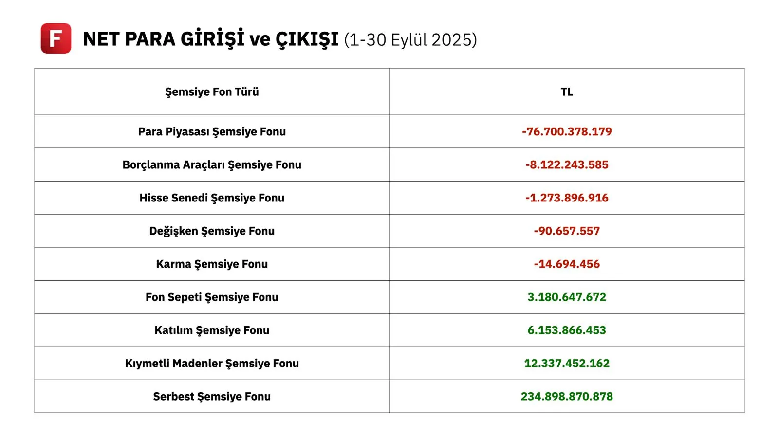 Eylül ayında izlenen 9 şemsiye fona toplamda 170 milyar TL tutarında para girişi gerçekleşti. Serbest şemsiye fonların alt kırılımlarına baktığımızda ise, yatırımcı ilgisinin hisse senedi yoğun fonlardan yeniden çıktığı görülüyor. Temmuz ve Ağustos aylarında gözlenen güçlü girişlerin ardından, yön Eylül ayında tekrar negatife döndü. Bu dönemde hisse senedi yoğun fonlardan yaklaşık 1,3 milyar TL tutarında çıkış yaşandı. Özellikle yabancı hisse senedi yoğun fonlara girişler sürerken, yerli hisse fonlarına olan yatırımcı ilgisinin azalmasıyla beraber para çıkışlarını görmeye devam ediyoruz.
