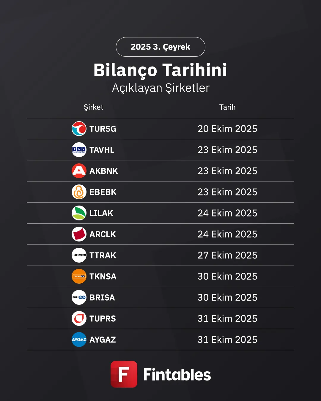 Bilanço dönemi öncesinde sektörledeki son duruma dikkat çekmek için verileri bir araya getirdiğimiz bir araştırma yazısı kaleme aldık. Bu yazıdan üçüncü çeyrek için sektörlerin performansına göz atabilirsiniz. Bu hafta Türkiye Sigorta haricinde finansal raporunu açıklayacağını duyuran şirketler TAV Havalimanları, Akbank ve Ebebek (23 Ekim), Lila Kağıt ve Arçelik (24 Ekim) olarak dikkat çekiyor.