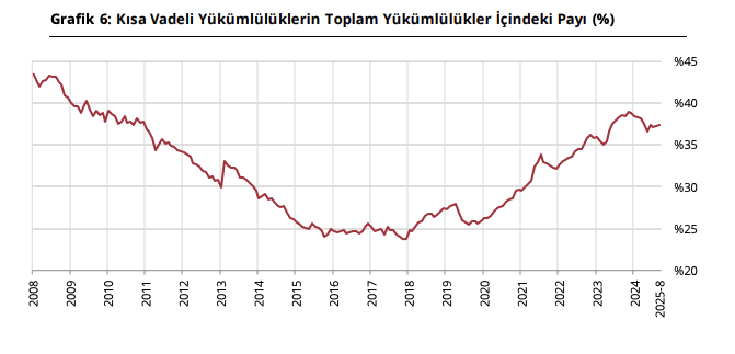Ağustos itibarıyla kısa vadeli döviz varlıkları 137,8 milyar dolar, kısa vadeli yükümlülükler 132,6 milyar dolar seviyesinde gerçekleşirken, kısa vadeli net döviz pozisyonu fazlası 5,2 milyar dolara geriledi. Kısa vadeli yükümlülüklerin toplam yükümlülükler içindeki payı %37 düzeyinde seyrederken, vade yapısında uzun vadeli borçlara yönelim dikkat çekiyor. 2008’de %45 seviyesinde olan bu oran 2016’da %25’e kadar gerilemiş, son yıllarda ise %38–40 bandına oturmuş durumda. Reel sektörün döviz yükümlülük kompozisyonu, kısa vadeli risklerini kısmen sınırladığına ancak uzun vadede döviz açık pozisyonunda kalıcı bir iyileşmenin henüz sağlanamadığını gösteriyor.