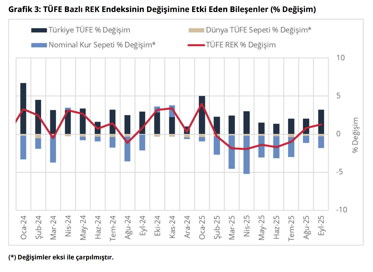 Eylül ayında TÜFE bazlı reel efektif döviz kuru (REK) 70,83 seviyesine yükseldi. Reel efektif döviz kuru, Türk lirasının reel bazda sınırlı da olsa değer kazandığına işaret ediyor. Artış, enflasyondaki hızlı yükselişten kaynaklandı. Zira TÜFE eylülde %3,23 artarken TL’nin dolar karşısında %1,2, euro karşısında %2,2 değer kaybetmesi, fiyat artışının kur etkisini aşmasına neden oldu. Böylece TL reel anlamda güçlenirken, REK endeksi hafif yukarı yönlü hareket etti. ÜFE tarafında ise %2,52’lik sınırlı artış, ÜFE bazlı REK’in 94,03 seviyesine çıkmasına yol açtı.