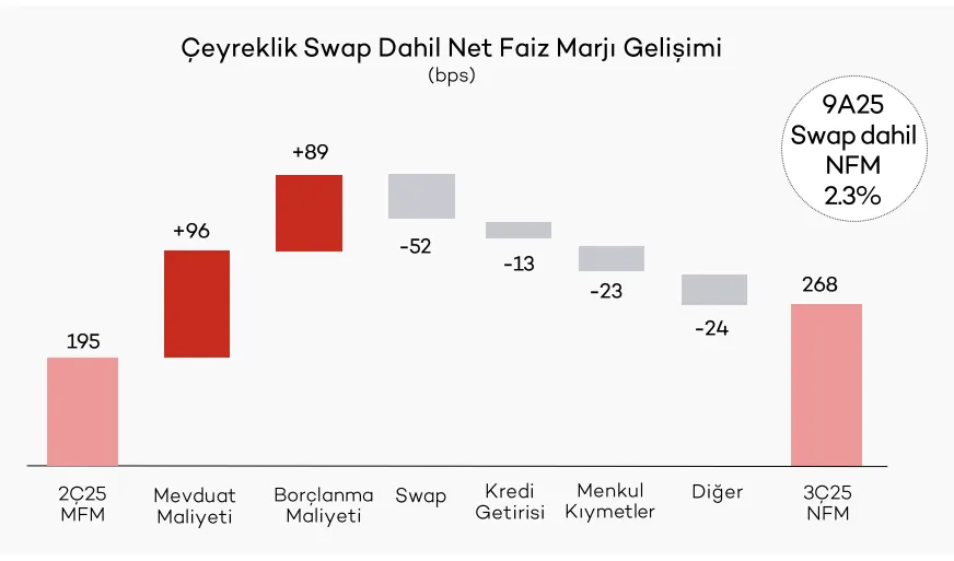 Bilanço tarafında büyüme istikrarlı şekilde devam etti. Bankanın aktifleri yıllık %22 artışla 3,23 trilyon TL’ye, kredi hacmi %26 artışla 1,68 trilyon TL’ye ulaştı. Swap dahil net faiz marjı üçüncü çeyrekte %2,3’e yükselerek önceki çeyreğe göre 73 baz puanlık toparlanma gösterdi. Bu iyileşmede özellikle mevduat ve borçlanma maliyetlerindeki düşüş etkili oldu. Akbank, 2025 yılı için enflasyon beklentisini %28–32, politika faizi tahminini %36 ve büyüme beklentisini %3,0 olarak revize etti.