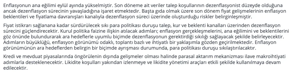 ☑ TCMB, ekim ayında politika faizini 100 baz puan indirerek %39,5’e çekti. Karar metinde dezenflasyonun devam ettiğini ancak yavaşladığına dikkat çekildi.