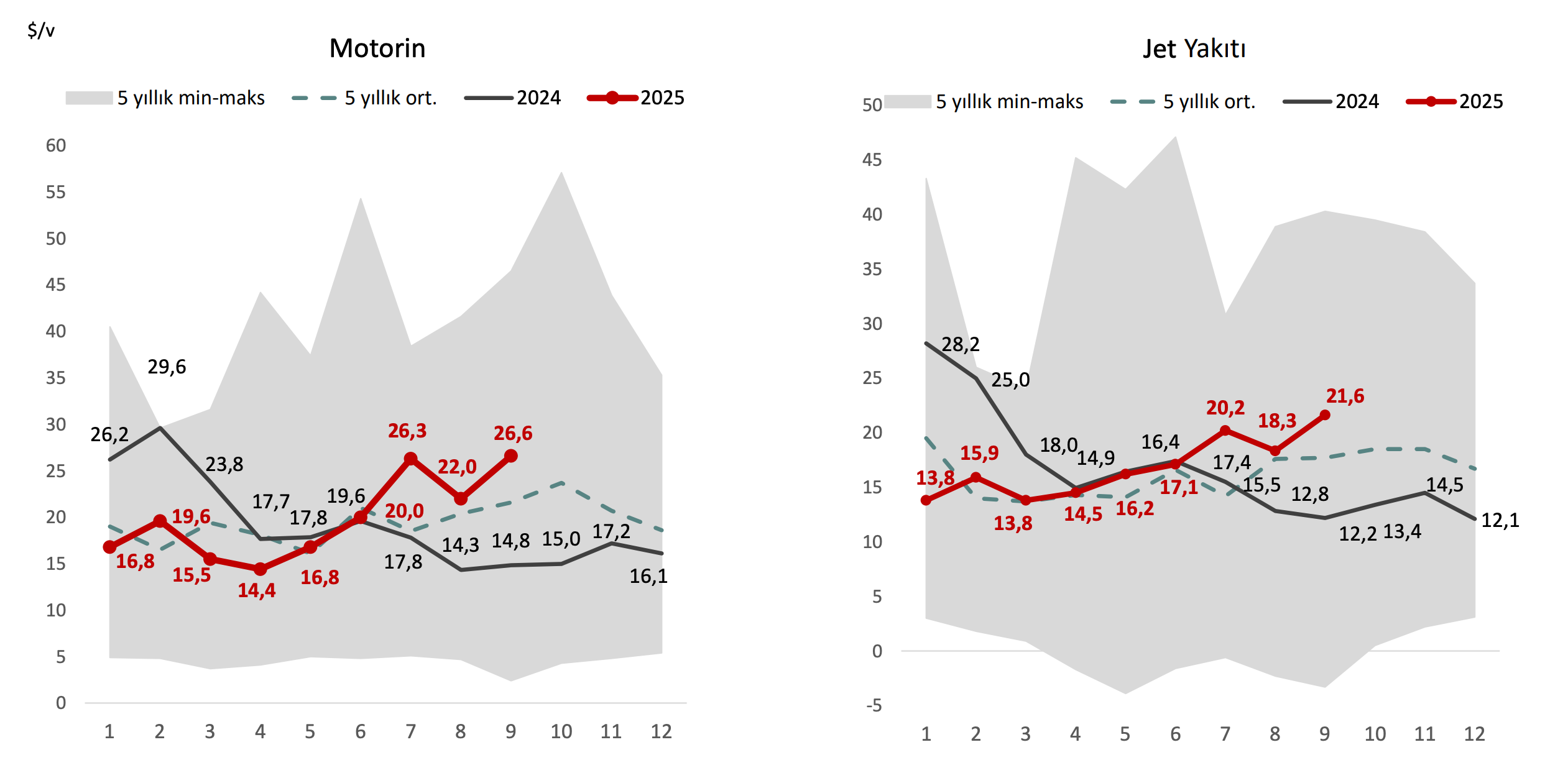 Rafineri sektöründe küresel dinamikler, petrolden bağımsız olarak marjların güçlü kalmasına sebep oluyor. Planlı bakım sezonunun yanı sıra Rusya’daki İHA saldırıları kapasite kayıplarını artırırken, düşük stoklar ve güçlü ürün talebi özellikle orta distilatlarda (dizel ve jet yakıtı) kârlılığı yüksek tutuyor. Küresel işleme miktarı ağustosta 84,2 mbd (million barrels per day – günlük milyon varil işleme kapasitesi) seviyesindeyken, ekimde bakım ve kesintilerin etkisiyle 82,5 mbd’ye gerilemesi bekleniyor. Bölgeler arası farklı dinamikler var. ABD’de rafineri kullanımı %95 ile güçlü seyrederken, Rusya’da saldırılar nedeniyle işleme kapasitesi doğrudan daraldı ve 4. çeyrekte ortalama 5,25 mbd seviyesinde kalacağı öngörülüyor. Orta Doğu’da bakım kaynaklı duruşlar 880 kbd’ye çıkarken kapasite 8,6 mbd’ye inecek; Avrupa’da ise eylülde 11,6 mbd’ye, ekimde 11,2 mbd’ye gerilemesi bekleniyor. Bu arz kısıtları, ürün marjlarının yüksek kalmasını destekliyor.