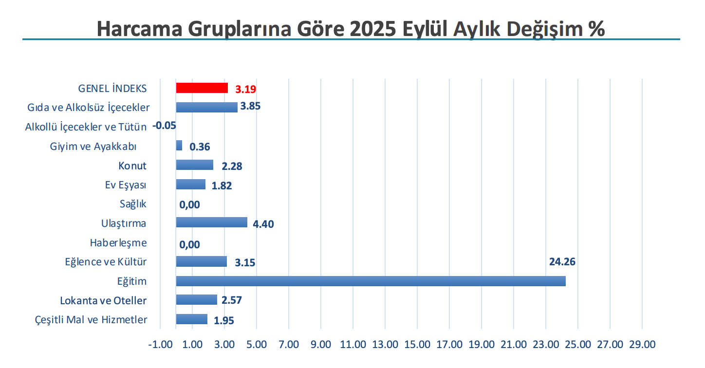 İstanbul’da tüketici fiyatları eylülde bir önceki aya göre %3,19 arttı. Yıllık enflasyon %40,75, yılbaşına göre artış ise %30,1 oldu. Aylık bazda en dikkat çekici yükseliş, yeni eğitim yılının etkisiyle %24,26 artan eğitim harcamalarında görülürken; ulaştırmada %4,40, gıda ve alkolsüz içeceklerde %3,85, eğlence ve kültürde %3,15’lik artışlar öne çıktı. Lokanta ve oteller, konut, çeşitli mal ve hizmetler ile ev eşyasında da fiyatlar yükselirken, en sınırlı artış %0,36 ile giyim ve ayakkabıda yaşandı. Alkollü içecekler ve tütünde %0,05’lik azalış kaydedilirken, haberleşme ve sağlıkta fiyat değişimi gözlenmedi.