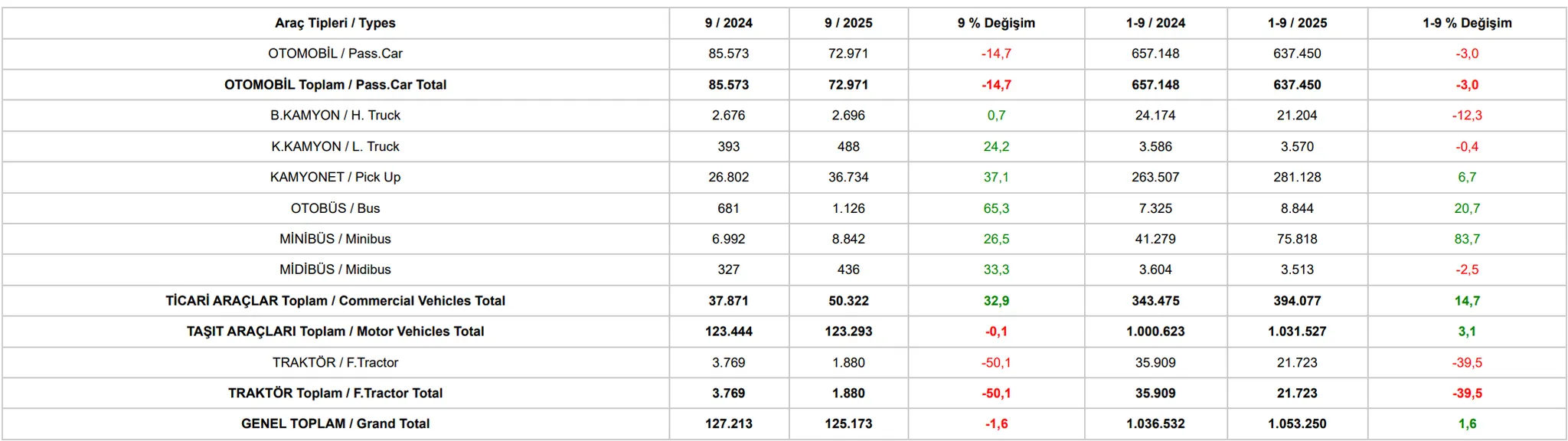 Eylül ayında otomotiv üretimi geçen yıla göre yatay seyretti. En yüksek üretim otobüste gerçekleşirken (%65), kamyonet, midibüs ve minibüs tarafında çift haneli güçlü artışlar görüldü. Buna karşın otomobil üretimi %14,7 düşerken traktör üretiminde %50’yi aşan sert bir daralma yaşandı. Bu nedenle genel üretim %1,6 azaldı. İlk dokuz ayın toplamında taşıt araçları üretimi %3,1 artışla 1 milyon 31 bin adede çıktı. İhracatta olumlu seyir sürüyor. Yılın ilk dokuz ayında otomotiv ihracatı %5,6 artarak 770 bine yaklaştı. Eylül ayında adet bazında %2,9’luk sınırlı düşüşe rağmen, ihracat geliri yıllık %5,9 artışla 3,56 milyar dolara ulaştı.