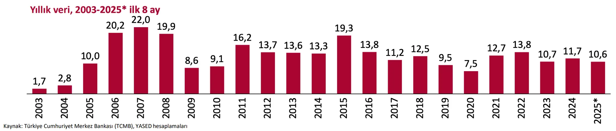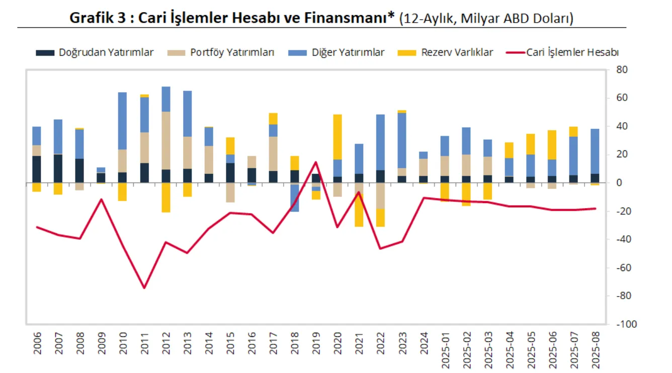 Ağustos ayında cari denge 5,45 milyar dolar fazla vererek beklentilerin üzerinde gerçekleşti. Bu güçlü fazla, turizm ve taşımacılıktan gelen yüksek hizmet gelirleriyle desteklendi. Hizmetler dengesindeki net giriş 9,5 milyar dolara ulaştı. Sadece turizm gelirleri 7,7 milyar dolarlık katkı yaptı. Dış ticaret açığının 2,8 milyar dolara gerilemesi ve altın-enerji hariç çekirdek dengenin 10 milyar dolarlık fazla vermesi, yapısal açıdan dengedeki iyileşmenin sürdüğüne işaret ediyor. Buna rağmen, 12 aylık kümülatif açık 18,3 milyar dolara ulaştı. Finansman tarafında doğrudan yatırımlar güçlü seyretti, portföy kaleminde ise karmaşık bir tablo görüldü. Hisse senetlerine 279 milyon dolarlık giriş olurken, Eurobond’larda 940 milyon dolarlık çıkış yaşandı. Banka ve reel sektör kredilerindeki 3,9 milyar dolarlık net giriş ise önemli bir denge unsuru oldu.