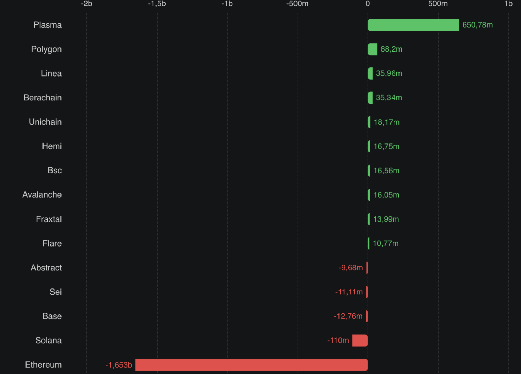 Hafta boyunca Plasma ağına $650,78 milyonluk giriş olurken Ethereum ağından ise $1,653 milyarlık varlık çıkışı yaşandı.