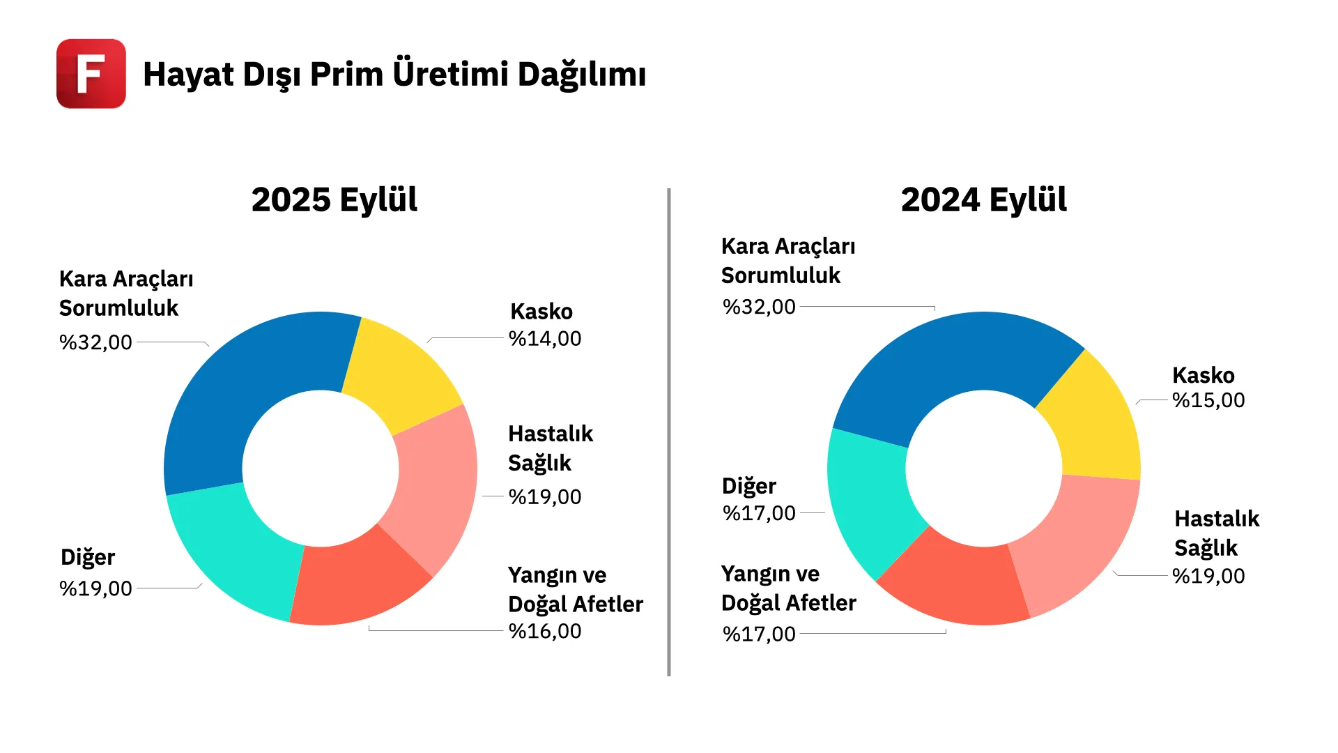 ✧ Eylül ayında toplam prim üretiminde en fazla payı olan ilk 3 branş; kara araçları sorumluluk, hastalık-sağlık ve yangın-doğal afetler. Bu branşlardaki yıllık büyüme oranları da sırasıyla %44, %42 ve %29 olarak kaydedildi.