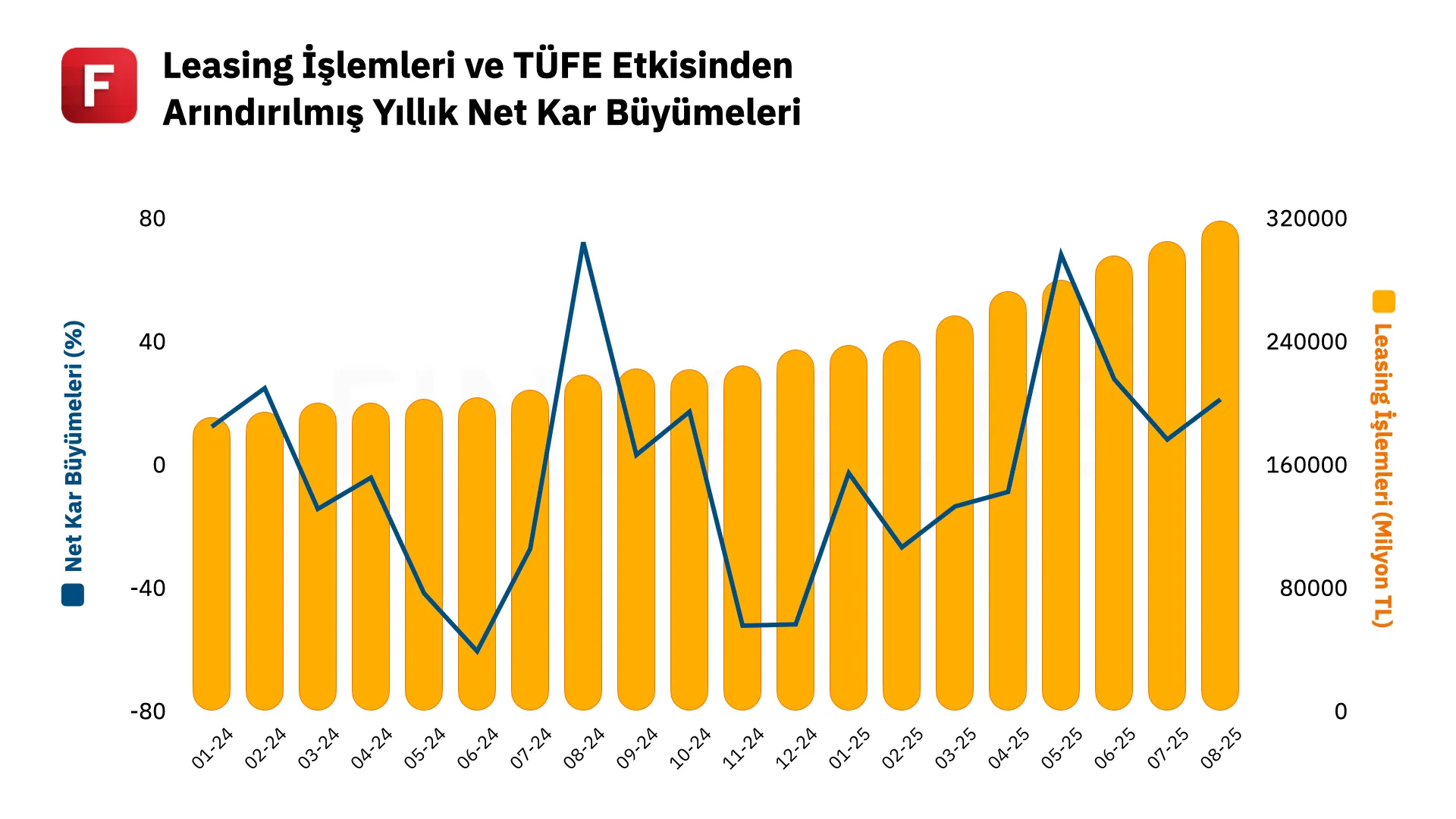 ✦ Finansal kiralama sektöründe, iki aylık net kâr düşüşünün ardından ağustos ayında yeniden aylık bazda artış görüldü. Sektörün net kârı, bir önceki aya göre %4 artarken, geçen yılın aynı ayına kıyasla %61 yükselerek 2 milyar 301 milyon TL’ye ulaştı. Net kiralama alacakları istikrarlı artışını sürdürerek aylık bazda %4, yıllık bazda ise %46 büyüyüp 318 milyar TL seviyesine çıktı. Aylık leasing gelirleri ise yıllık bazda %10 artış göstererek 5 milyar 420 milyon TL olarak gerçekleşti.