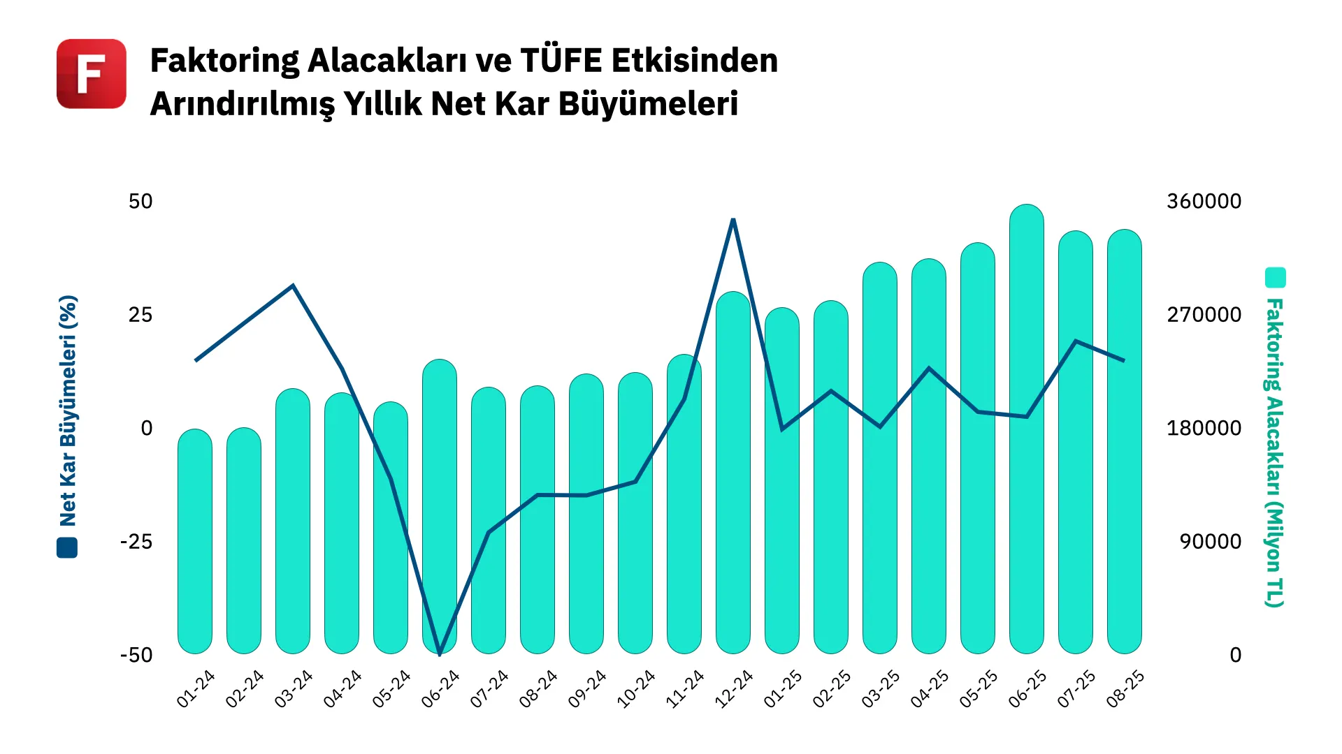 ✦ BDDK verilerine göre faktoring sektörü, temmuz ayındaki rekor net kârın ardından ağustos ayında da güçlü kârlılığını sürdürdü. Sektörün net kârı, geçen yılın aynı ayına göre %52 artarak 2 milyar 877 milyon TL’ye ulaşırken, bir önceki aya kıyasla %3 oranında sınırlı bir gerileme gösterdi. Toplam alacak tutarı ise aylık bazda %0,3 artışla yatay seyrederken, yıllık bazda %58 yükselerek 337 milyar TL’ye ulaştı. Aylık faktoring gelirleri, temmuza göre %4 düşüş kaydederken, geçen yılın aynı dönemine göre %45 artışla 14 milyar 795 milyon TL oldu.
