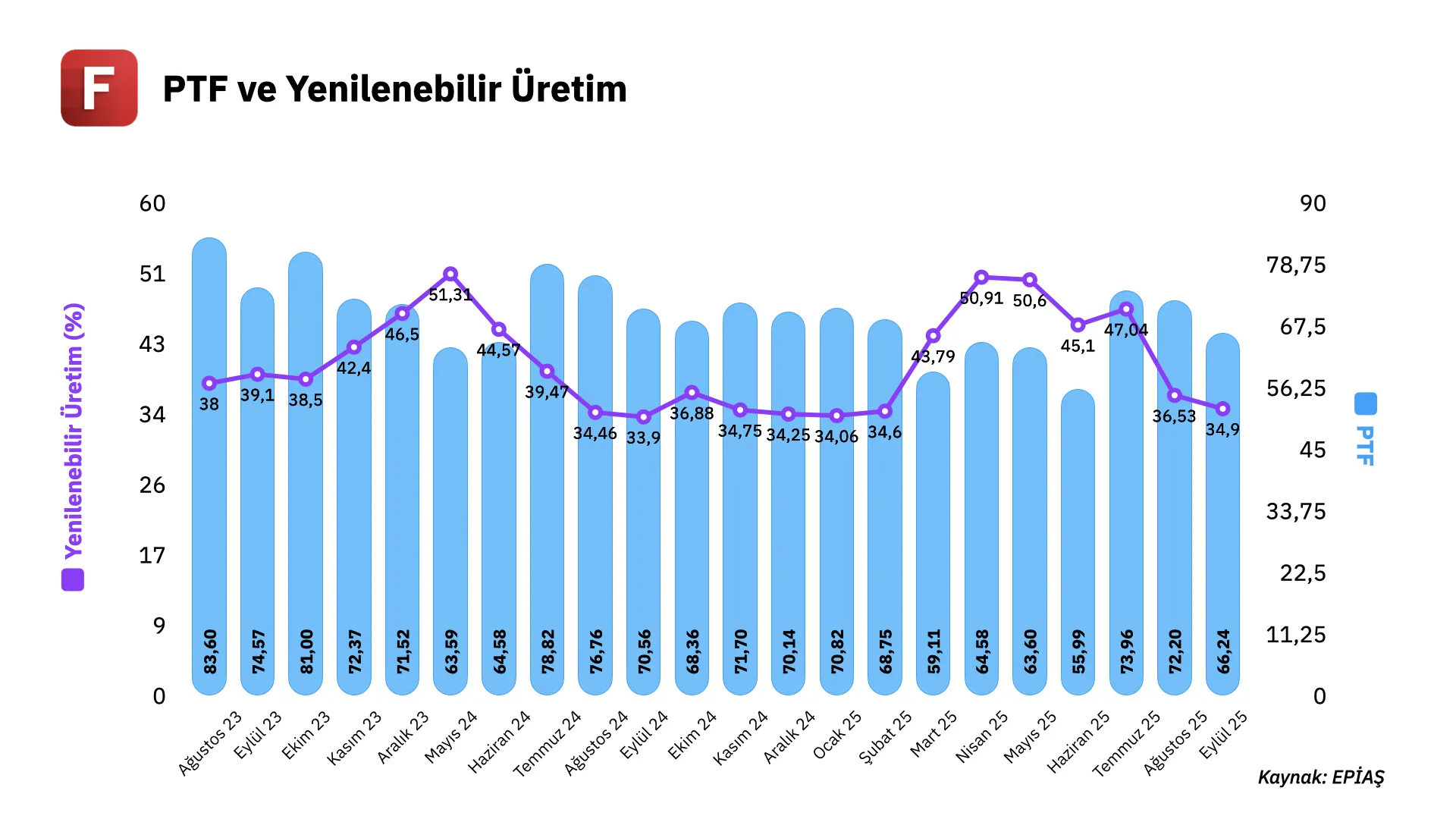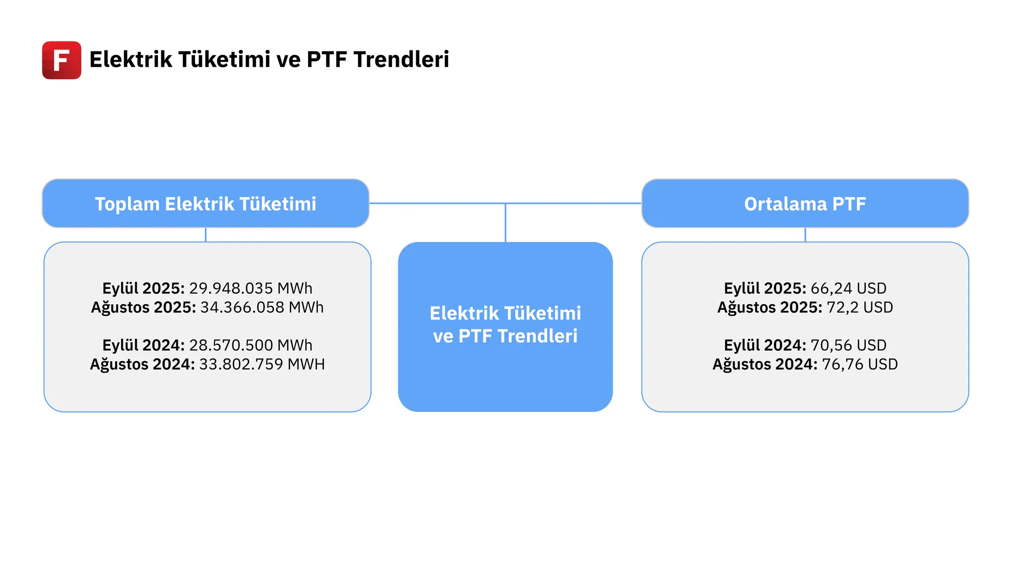 ✦ Haziran 2025 hariç son 27 ayın tamamında elektrik tüketiminde yıllık bazda artış kaydedilmesine rağmen fiyatlarda aşağı yönlü seyrin sürdüğünü görüyoruz. Eylül ayında ortalama PTF 66,2 USD seviyesinde gerçekleşerek geçen yılın aynı dönemine göre %6, bir önceki aya göre ise %8,2 oranında düşüş gösterdi.