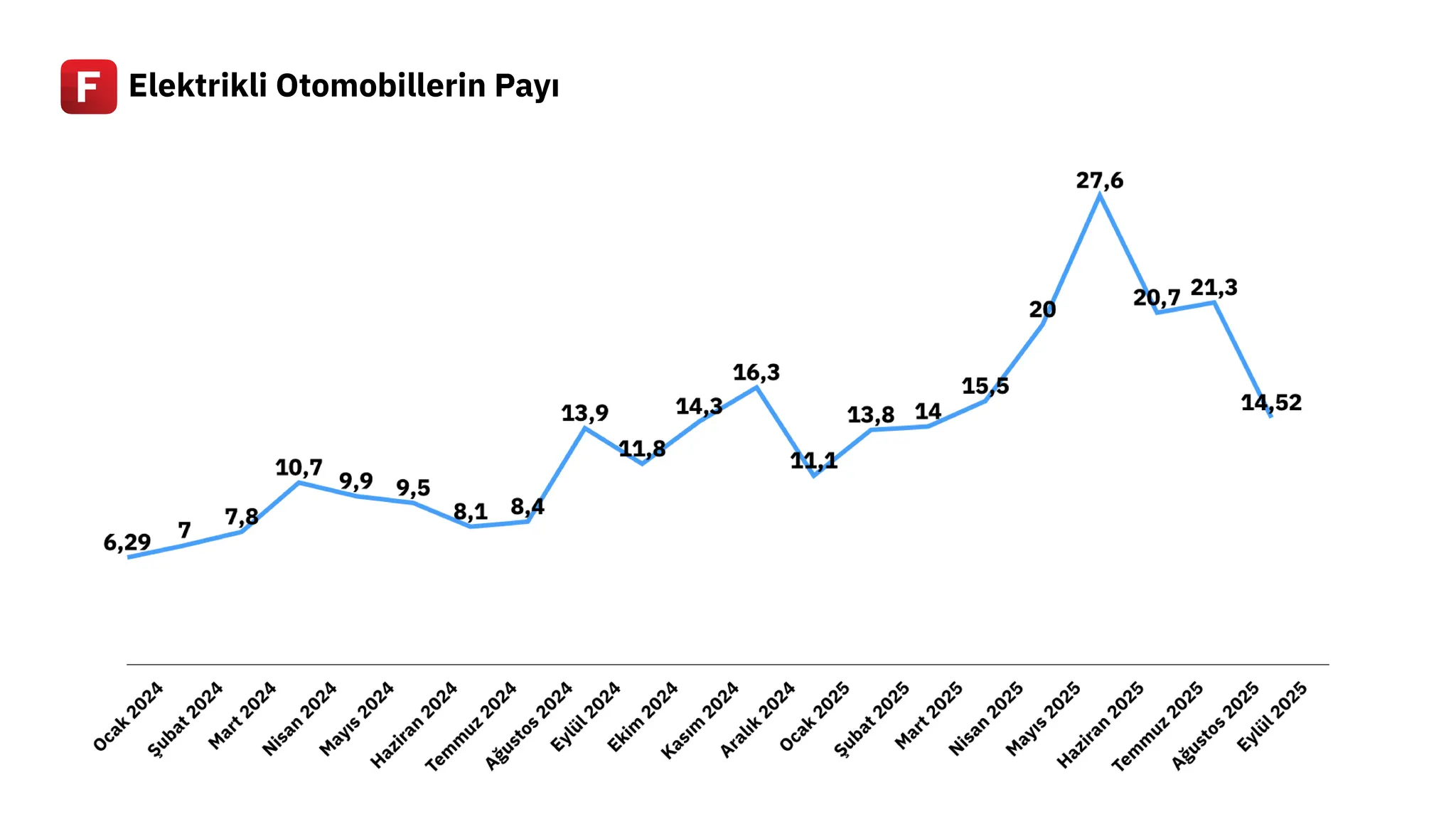 ✦ Otomobil pazar tipine göre incelendiğinde, eylül ayında toplam pazarın %46’sını benzinli, %29’unu hibrit araçlar oluşturdu. Elektrikli araçların payı %14,52’ye gerilerken, ağustosta devreye giren ÖTV artışının elektrikli araçlara olan talebi hibrite yönlendirdiği görülüyor. Dizel araçların payı ise %7,24 seviyesinde kaldı.