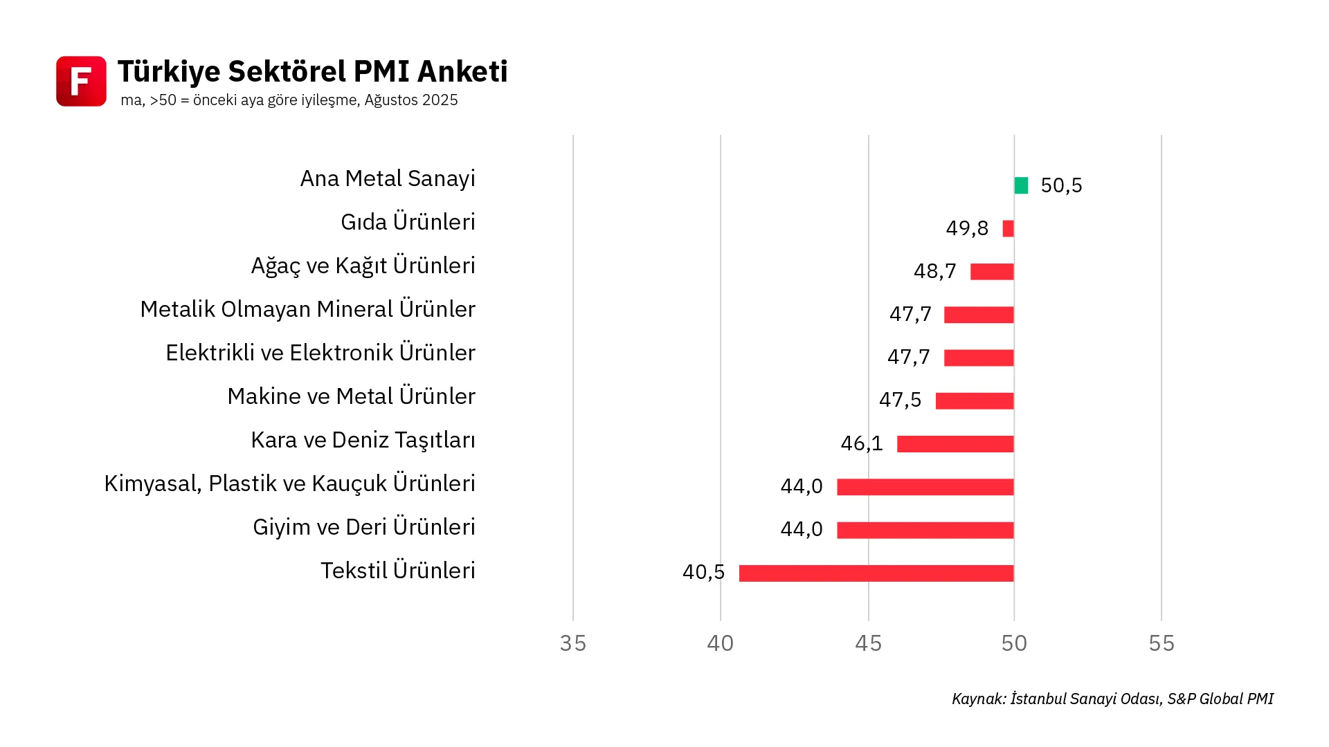 ✧ Sektörel bazda, ağustos ayında yalnızca ana metal sanayi 50 eşik değerinin üzerine çıkarak faaliyet koşullarında iyileşme kaydetti. Ağaç-kağıt ürünleri ile gıda ürünleri sektörlerinde PMI değerleri 50 seviyesine yaklaşarak daralma hızının yavaşladığı sinyalini verdi. Diğer tüm sektörlerde ise faaliyet koşullarındaki bozulma sürdü; en belirgin zayıflama tekstil ürünleri sektöründe kaydedildi. Yeni ihracat siparişleri sadece makine ve metal ürünleri sektöründe artarken, diğer tüm sektörlerde dış talebin zayıf seyri devam etti. İstihdam tarafında da görünüm baskı altında kaldı. Ana metal ile makine-metal ürünleri sektörleri istihdamını artırabilen iki grup olurken, tekstil ile kimyasal, plastik ve kauçuk ürünleri sektörlerinde kayda değer düşüşler yaşandı. Satın alma faaliyetleri genel olarak zayıflarken, yalnızca ana metal sektöründe artış gözlendi.