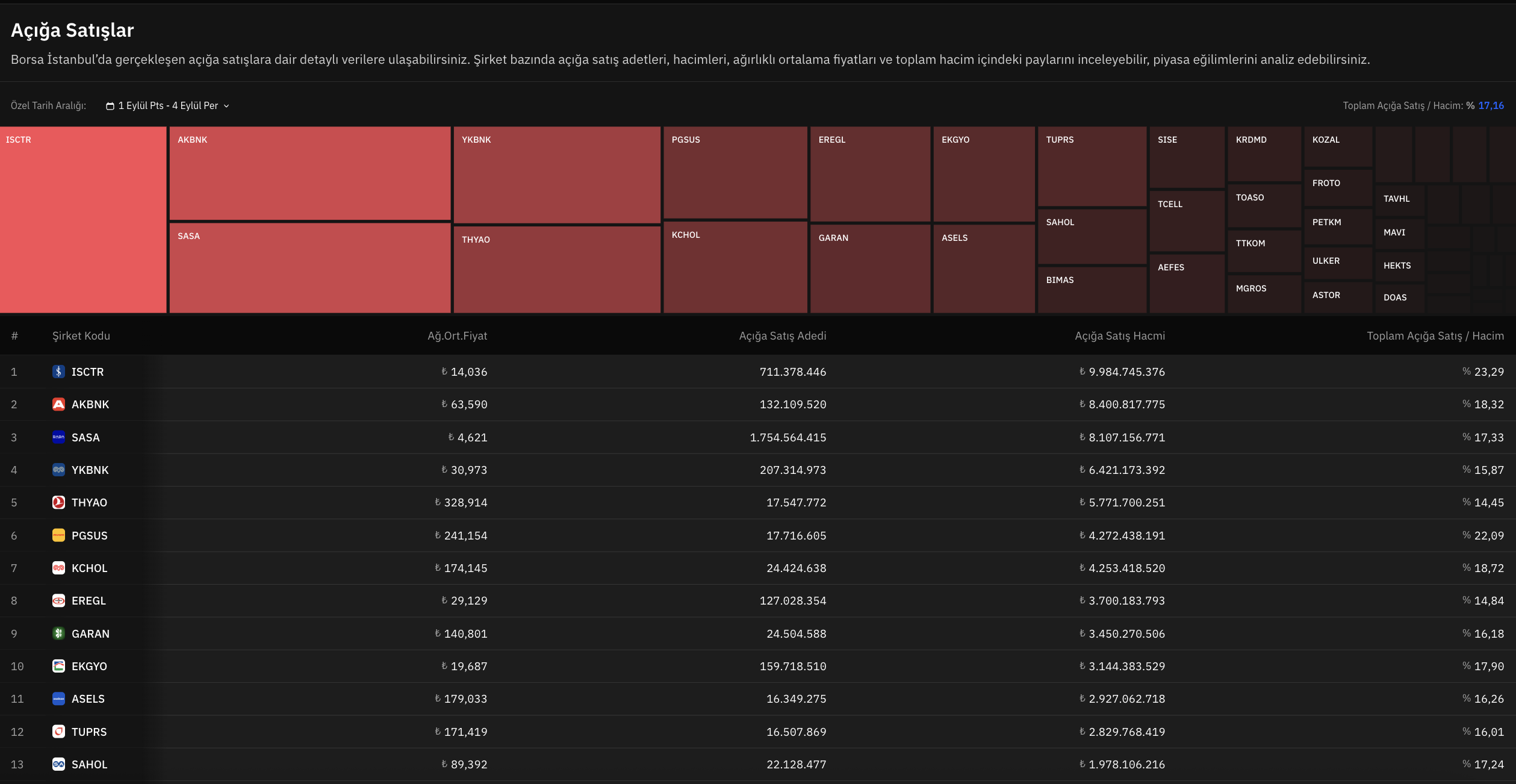 Borsa İstanbul’da gerçekleşen açığa satışlara dair detaylı verilere Fintables Açığa Satışlar sayfasından ulaşabilirsiniz. Şirket bazında açığa satış adetleri, hacimleri, ağırlıklı ortalama fiyatları ve toplam hacim içindeki paylarını inceleyebilir, ısı haritasıyla piyasa eğilimlerini analiz edebilirsiniz.