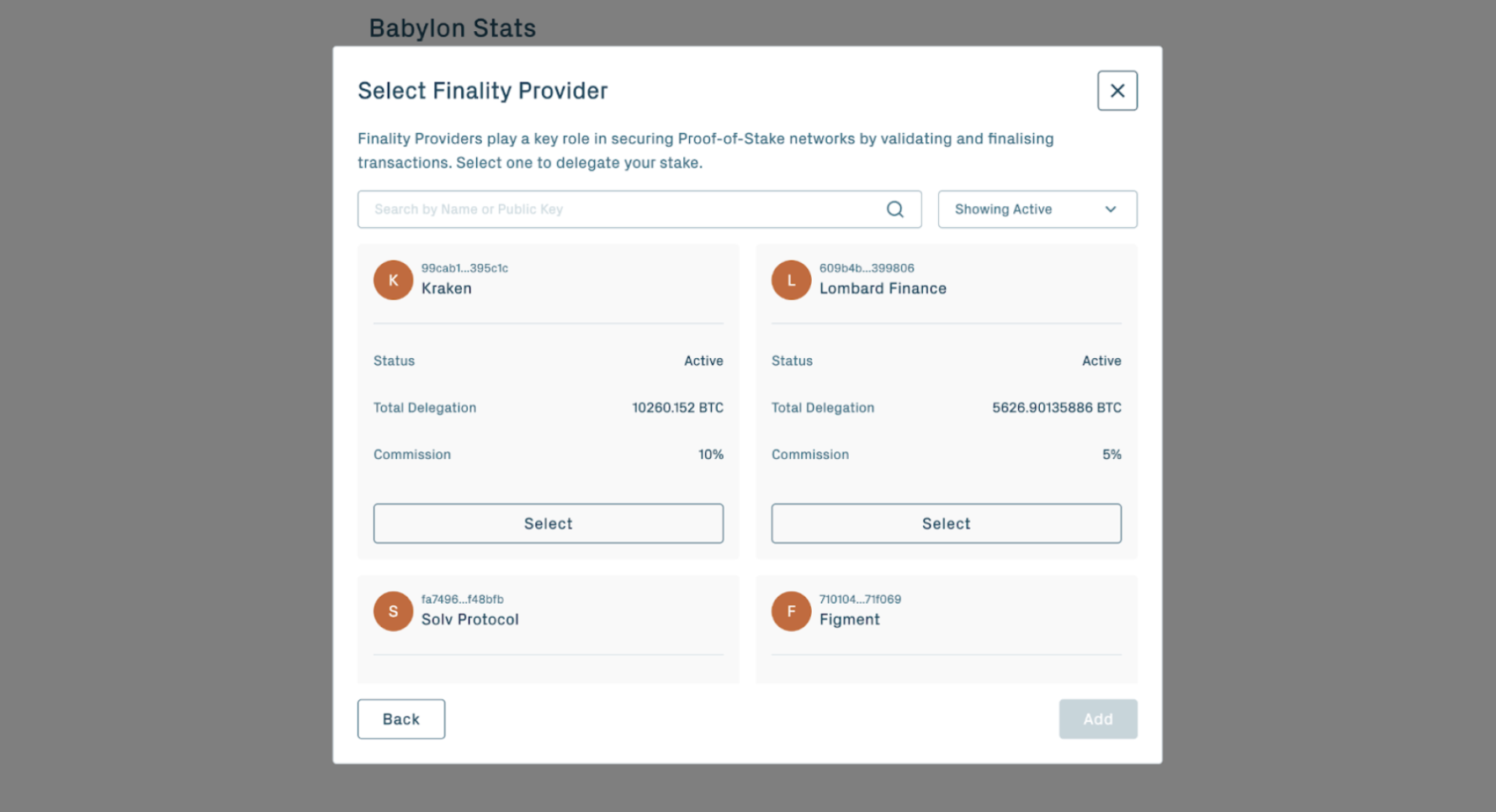 • BTC’yi Babylon panelinde her BSN için bir Finality Provider’a stake ediyorsunuz.