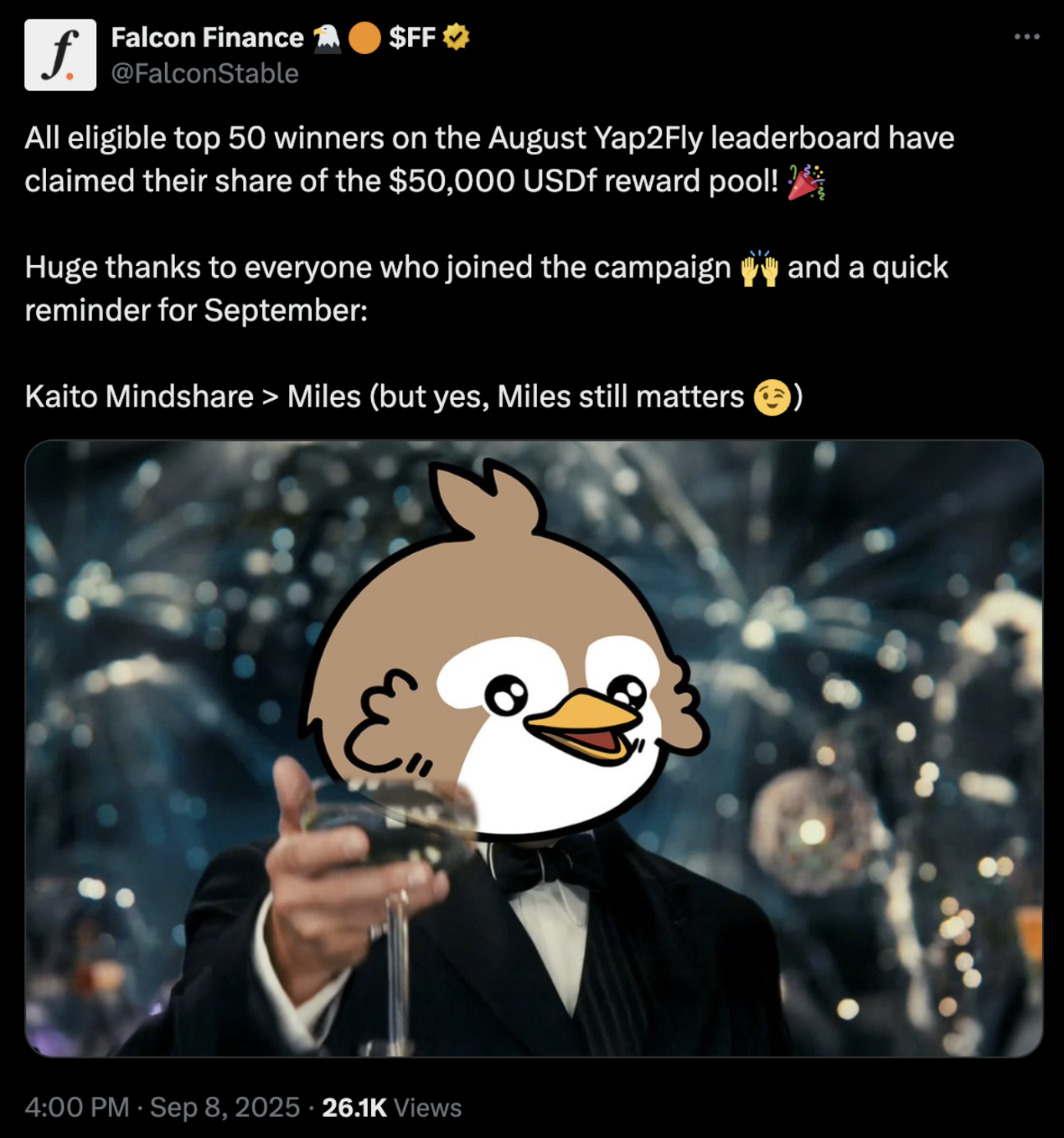 Yap2Fly, Falcon + Kaito ortak görevidir. X (Twitter) Mindshare skorunuz (özgünlük, etkileşim, erişim) ile Falcon Miles’ı tek bir liderlik sıralamasında birleştirir.