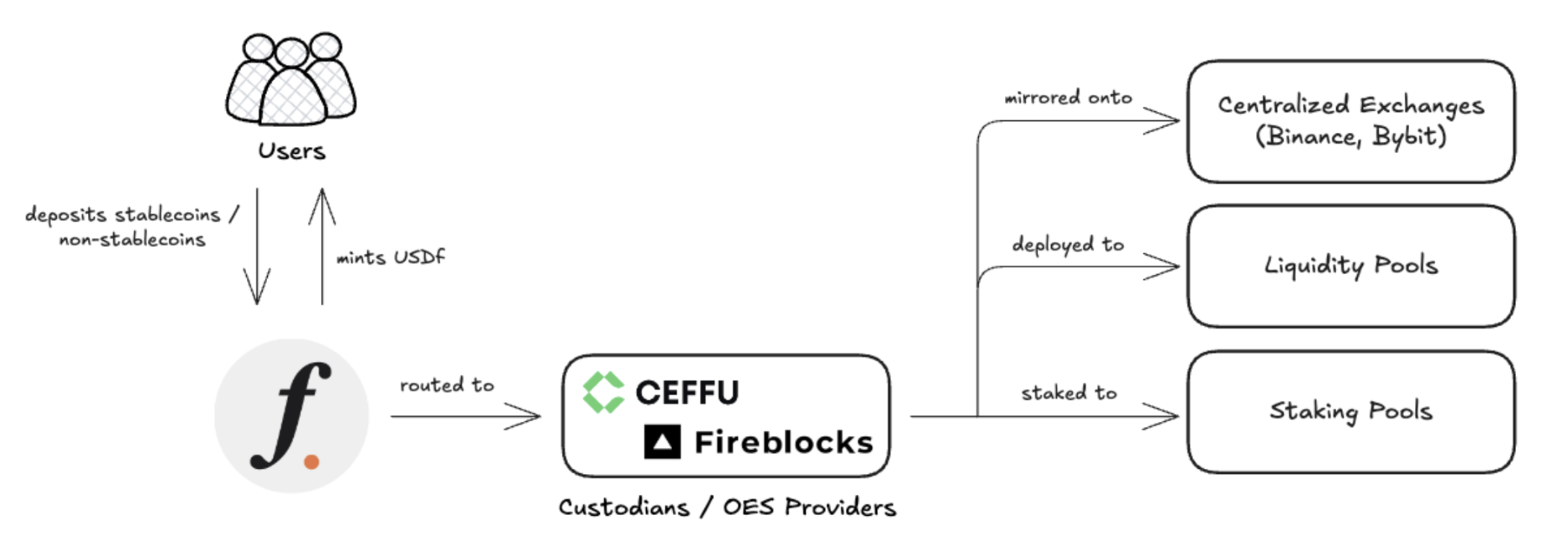 Falcon’un diğer önemli özelliği ise giriş kısmında da bahsettiğimiz gibi CeDeFi modelidir. Yani varlıklar doğrudan protokolün elinde tutulmaz; Fireblocks ve Ceffu gibi kurumsal saklama çözümlerinde güvence altına alınır. Bu varlıklar, güvenli bir şekilde merkezi borsalara veya zincir üstü havuzlara yansıtılır ve arbitraj, likidite sağlama ya da staking gibi yöntemlerle getiri üretilir.